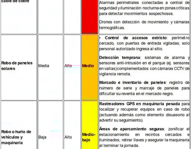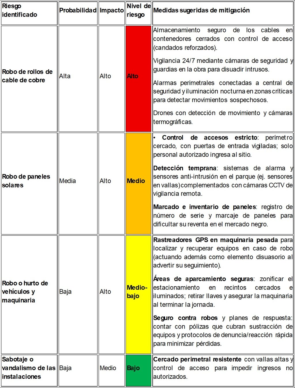 A continuación se presenta una matriz de riesgo simulada para la seguridad patrimonial de una planta fotovoltaica en etapa intermedia de construcción. Se identifican riesgos clave con su probabilidad de ocurrencia, impacto potencial y el nivel de riesgo resultante. Este nivel se clasifica en cuatro categorías – alto, medio, medio-bajo y bajo – las cuales se codifican visualmente con emojis (🔴 Alto, 🟠 Medio, 🟡 Medio-bajo, 🟢 Bajo). Para cada riesgo se listan también medidas sugeridas de mitigación orientadas a reducir la probabilidad de ocurrencia o minimizar el impacto en caso de materializarse el evento